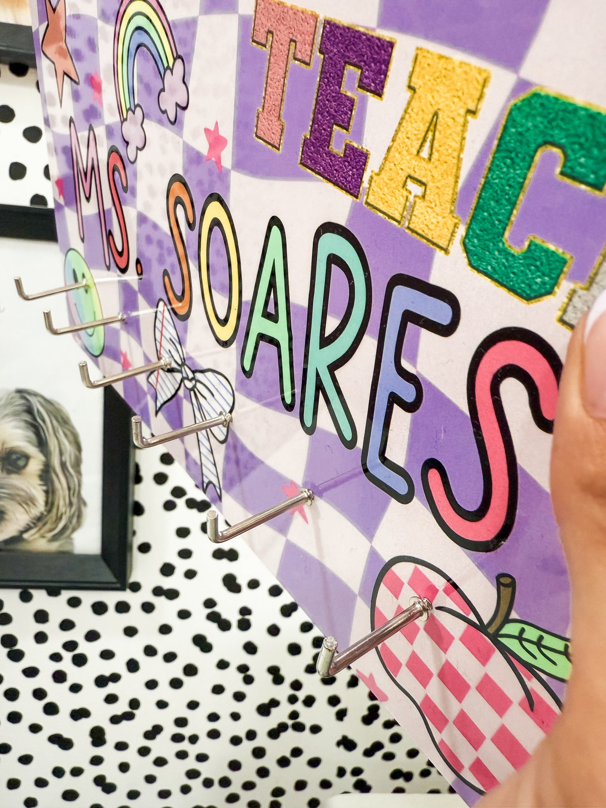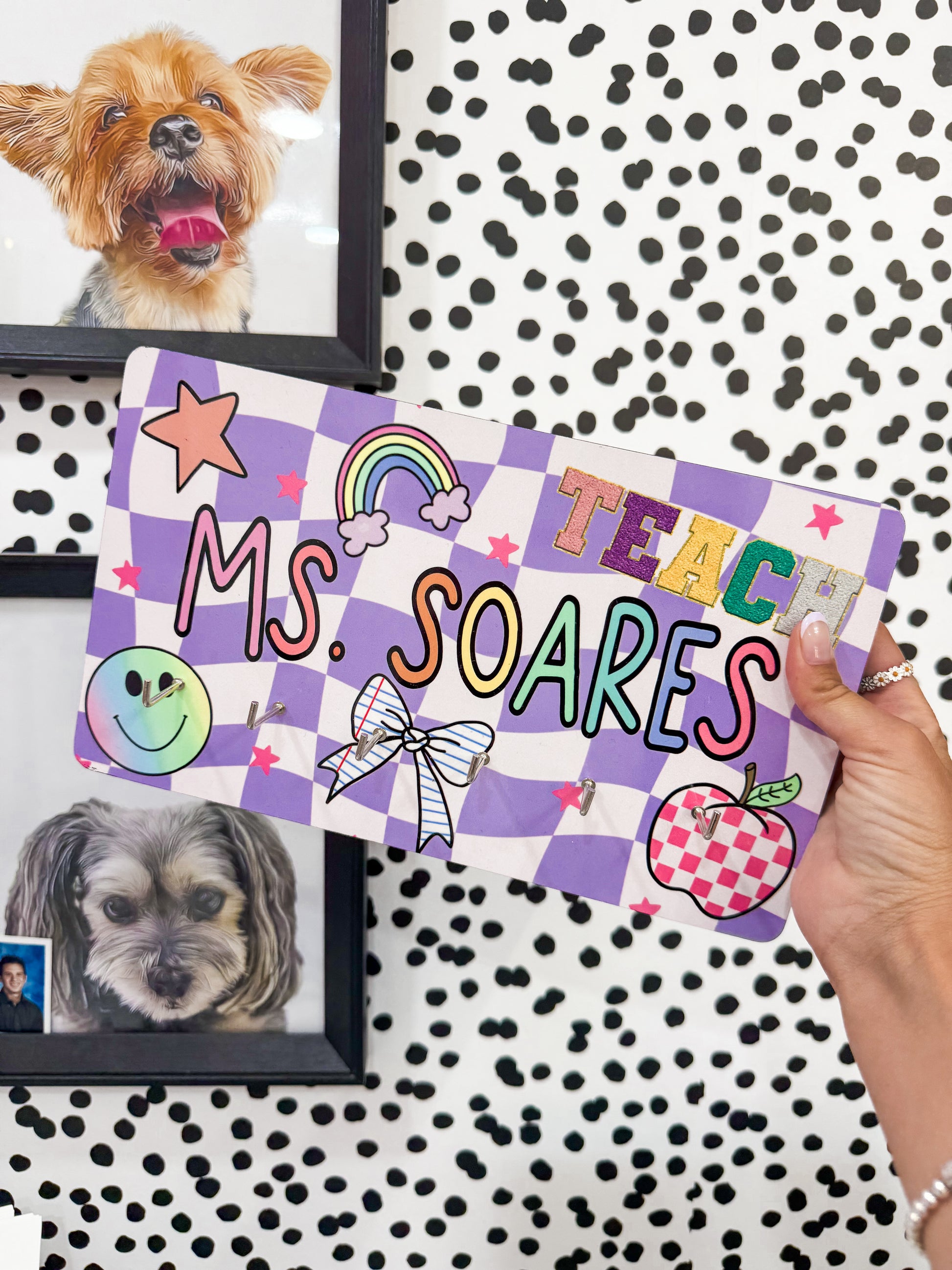 16 x 27 cm lanyard hook. Made from MDF. Comes with 6 lanyard hooks. Command strips can be used to secure to wall but can also be screwed in.